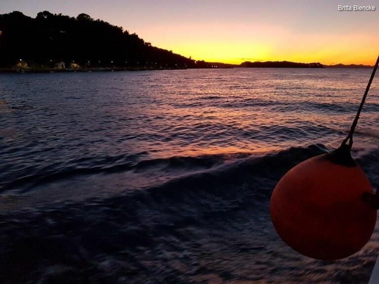 Pünktlich zur blauen Stunde brachte uns die Seilbahn wieder nach unten und wir bestiegen ein privates Boot, um unser letztes Abendessen auf Koločep, einer der vielen vorgelagerten Inseln, einzunehmen.