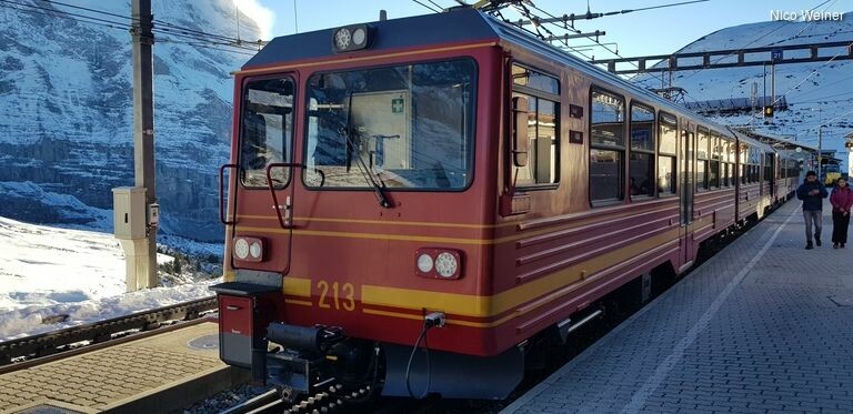 Mit der Zahnradbahn geht es immer weiter nach oben Richtung Jungfraujoch, dem höchst gelegenen Bahnhof Europas. Oberhalb der Baumgrenze, weißer Schnee und die Luft wird dünner. Auf 3160 Meter kommt es zum Halt. Die letzte Station vor dem Gipfel nennt sich „Eismeer“, diesen Namen hat sie sich mehr als verdient. Hier gibt es ein Panoramafenster von dem man einen spektakulären Blick auf die Gletscherlandschaft hat. Nur ein kleiner Vorgeschmack, von dem was noch kommen wird. Nun geht es zurück in den nostalgischen Zug, der weiter hochfährt. Oben angekommen, geht es noch immer weiter, mit einem Fahrstuhl, der durch den Berg bis zur Spitze eine Höhe von 4 158 Meter erreicht. Bei dieser Fahrt sieht man durch die Glastüren die Felswände an sich vorbeiziehen.